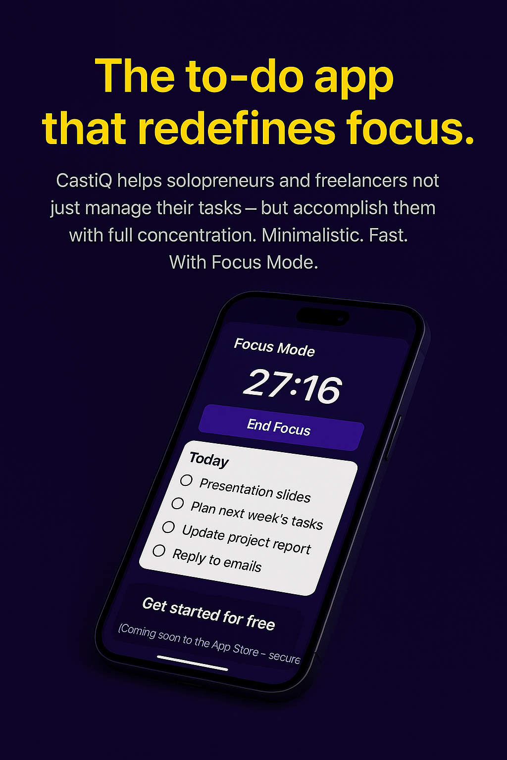 Castiq empowers solopreneurs and freelancers to focus and complete tasks efficiently.